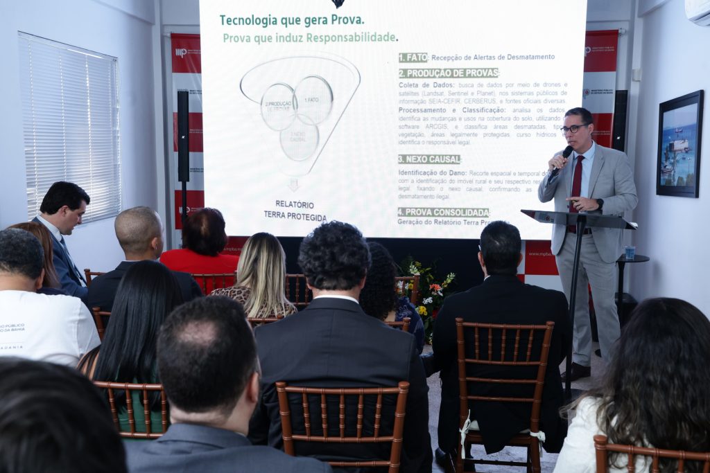 O promotor de Justiça explicou que o projeto utiliza ferramentas de geotecnologia e inteligência artificial para verificar, com mais agilidade, as áreas que estão sendo desmatadas, identificando os infratores dos crimes ambientais. Além disso, disponibiliza um painel para consulta pública com os dados da evolução da cobertura vegetal no estado, que desmata área equivalente a 400 estádios de futebol diariamente. Outro benefício é a escuta social, que está sendo agregada ao Terra Protegida no sentido de trazer as falas de importantes atores sociais para produzir conhecimentos necessários a solução do problema do desmatamento. Esses e outros benefícios foram destacados por Augusto Matos, que frisou que o “Terra Protegida é uma ferramenta primordial ao combate do desmatamento e enfrentamento das mudanças climáticas, garantindo a preservação do bioma para as próximas gerações”.