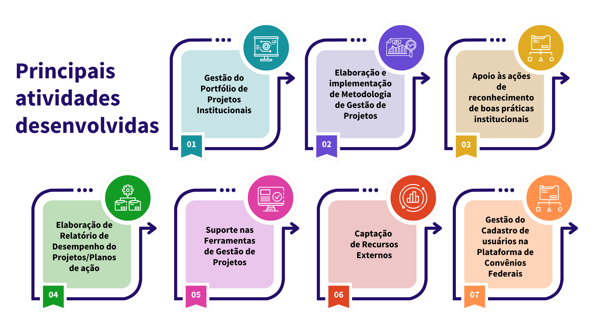 A Unidade de Projetos Institucionais e Captação de Recursos atua como um escritório de projetos, oferecendo suporte na elaboração de projetos e na captação de recursos externos. Além disso, esta unidade desempenha um papel importante na promoção de uma cultura de planejamento e gestão de projetos. Entre as principais atividades desenvolvidas, destacam-se:
