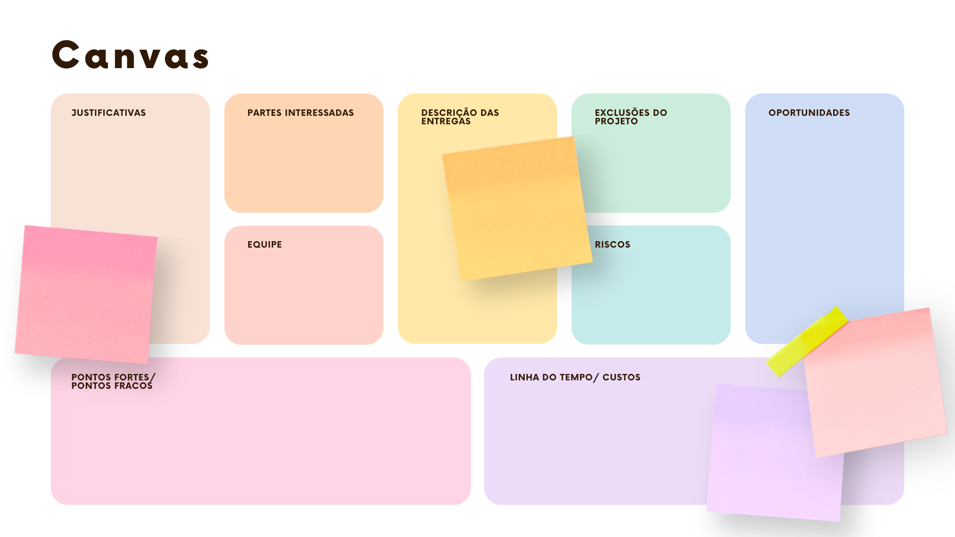 Também disponibilizamos a ferramenta Canvas para facilitar a criação do TAP e organizar as ideias da equipe. O Canvas funciona como um quadro visual onde as ideias são dispostas de forma clara e objetiva, permitindo ao gerente e ao time estruturar os principais aspectos do projeto. Com ele, é possível alinhar expectativas, identificar recursos, entender melhor os problemas e soluções, e definir o valor que o projeto vai gerar. O recurso facilita o compartilhamento de informações de maneira simples, garantindo que todos os envolvidos tenham uma visão comum do projeto.